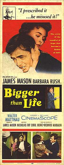 Bigger Than Life is an American DeLuxe Color CinemaScope film made in 1956 directed by Nicholas Ray and starring James Mason, who also co-wrote and produced the film, about a school teacher and family man whose life spins out of control upon becoming addicted to cortisone. The film co-stars Barbara Rush as his wife and Walter Matthau as his closest friend, a fellow teacher. Though it was a box-office flop upon its initial release,[2] many modern critics hail it as a masterpiece and brilliant indictment of contemporary attitudes towards mental illness and addiction.[3] In 1963, Jean-Luc Godard named it one of the ten best American sound films ever made.[4]