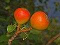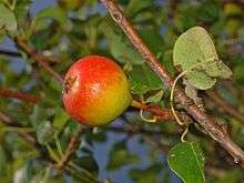 Pyrus pyraster is a deciduous plant reaching 3–4 metres (9.8–13.1 ft) in height as medium sized shrub and 15–20 metres (49–66 ft) as a tree.[2] Unlike the cultivated form the branches have thorns.[2] The leaves are ovate with serrated margins. The flowers have white petals. The stamens are equal to the length of styles.[2] The flowering period extends from April through May.[2] The fruits reach 1–4 centimetres (0.39–1.57 in) in diameter.[2] and ripens in late Summer to early Autumn.They are quite hard and astringent, but they have a sweet taste and are edible when they are really ripe and fall from the tree.[2] The seeds ripen in September.